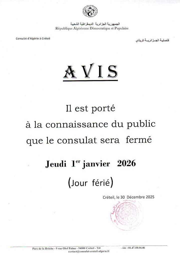 Fermeture du Consulat à l’occasion du 1 Novembre (Fête Nationale)